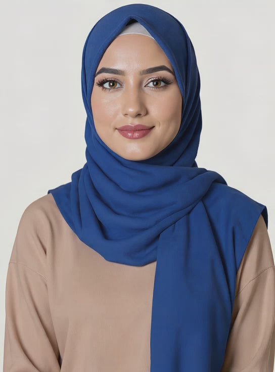 De kleur Midnight Blue is een rijk, donkerblauw dat een perfect alternatief biedt voor zwart. Het geeft iedere outfit een geraffineerde touch – of je nu naar je werk gaat, een formele gelegenheid bijwoont of je dagelijkse stijl wilt versterken. Deze hijab is moeiteloos te combineren met zowel neutrale als warme tinten.